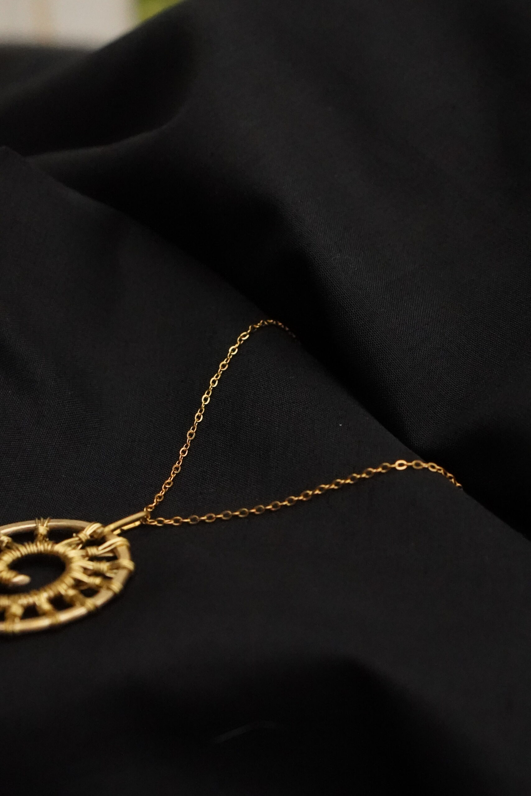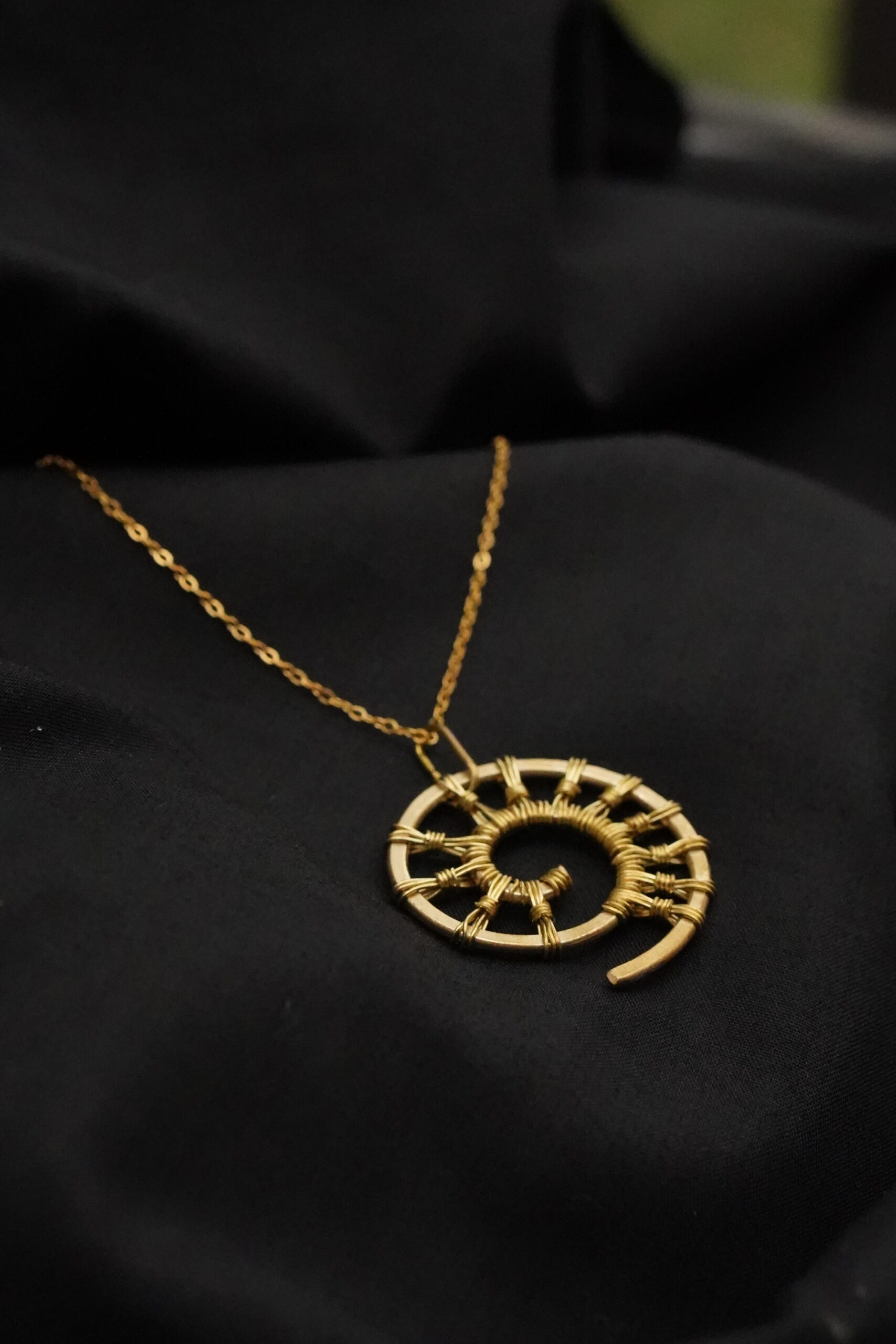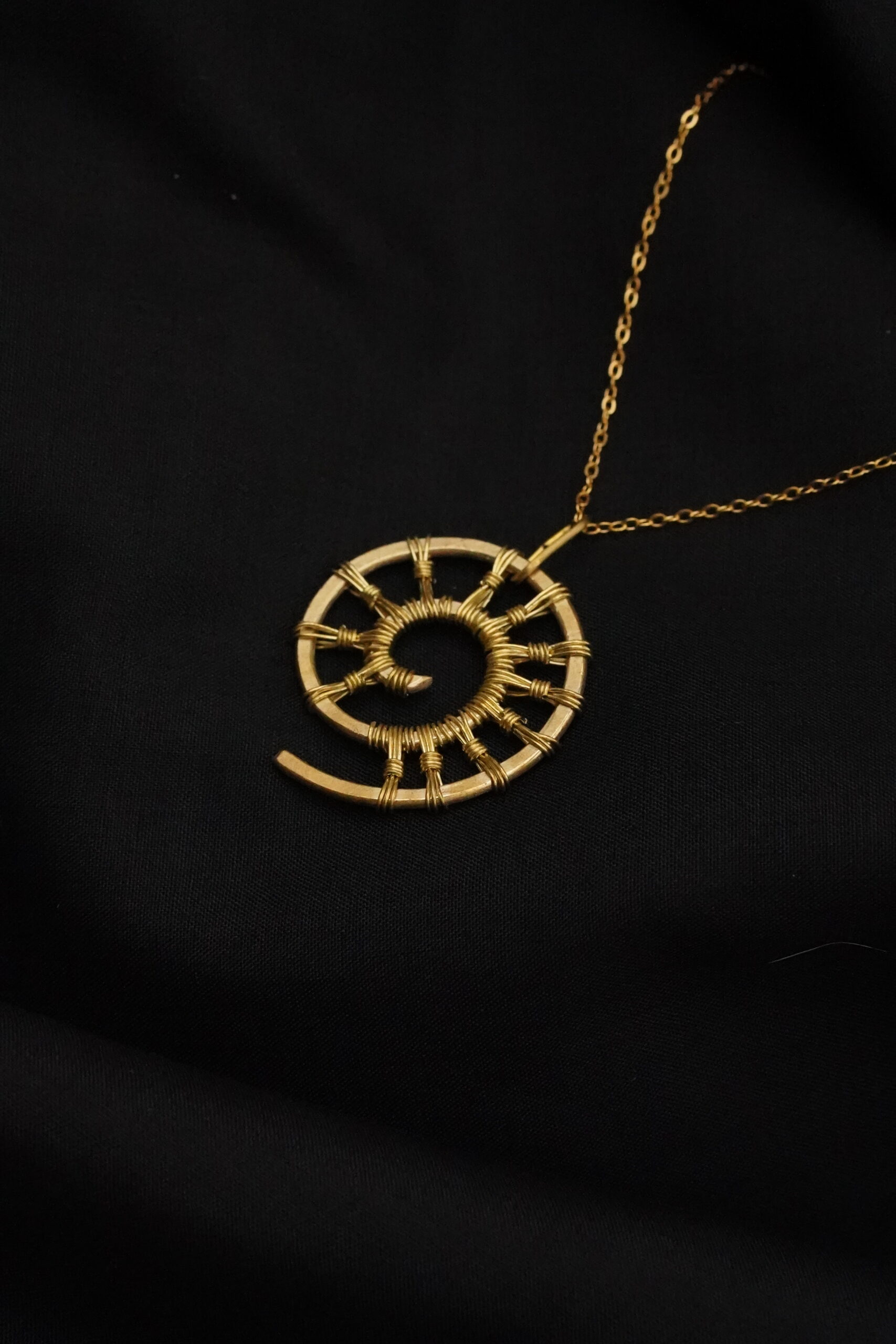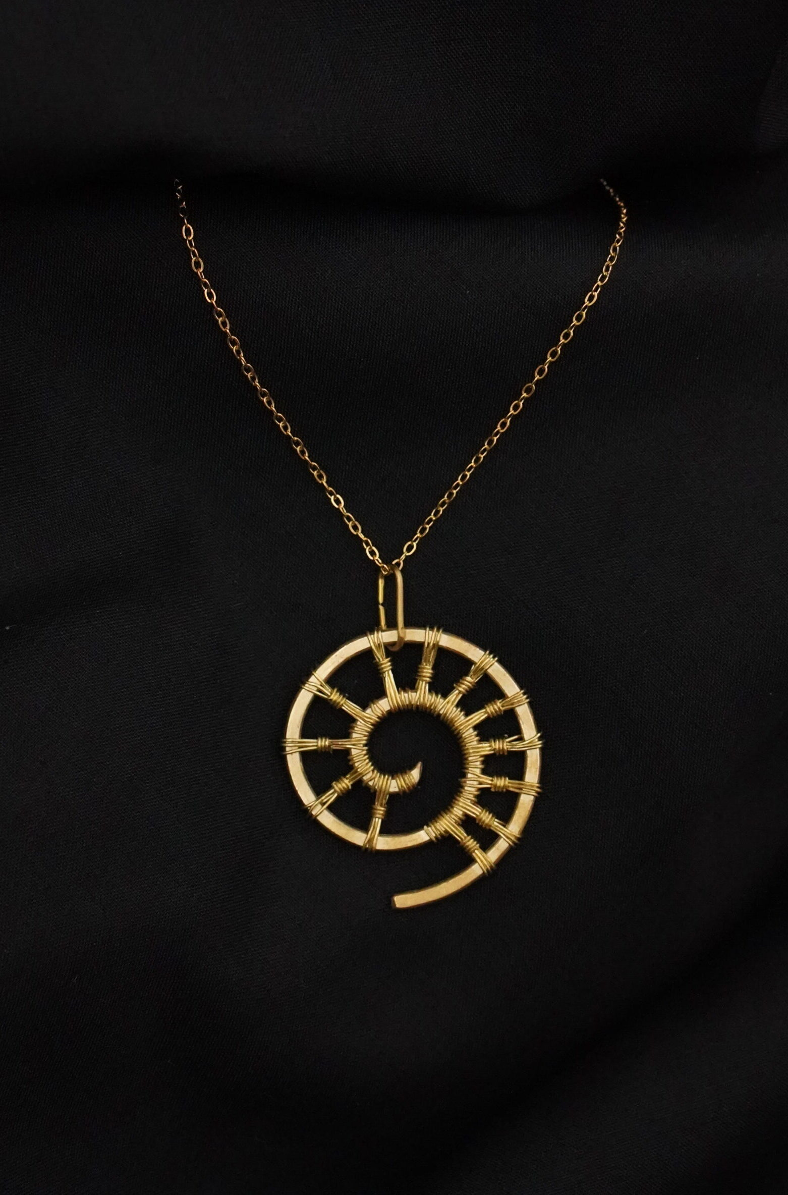Diese goldfarbene Halskette besteht aus einem feinen Edelstahlkettchen und einem handgefertigten Spiralanhänger. Die filigrane Drahtstruktur bildet ein kreisförmiges Muster mit radialer Segmentierung. Das Design erinnert an natürliche Formen wie Muscheln oder Spiralen und verleiht dem Schmuckstück eine dezente, organische Optik.