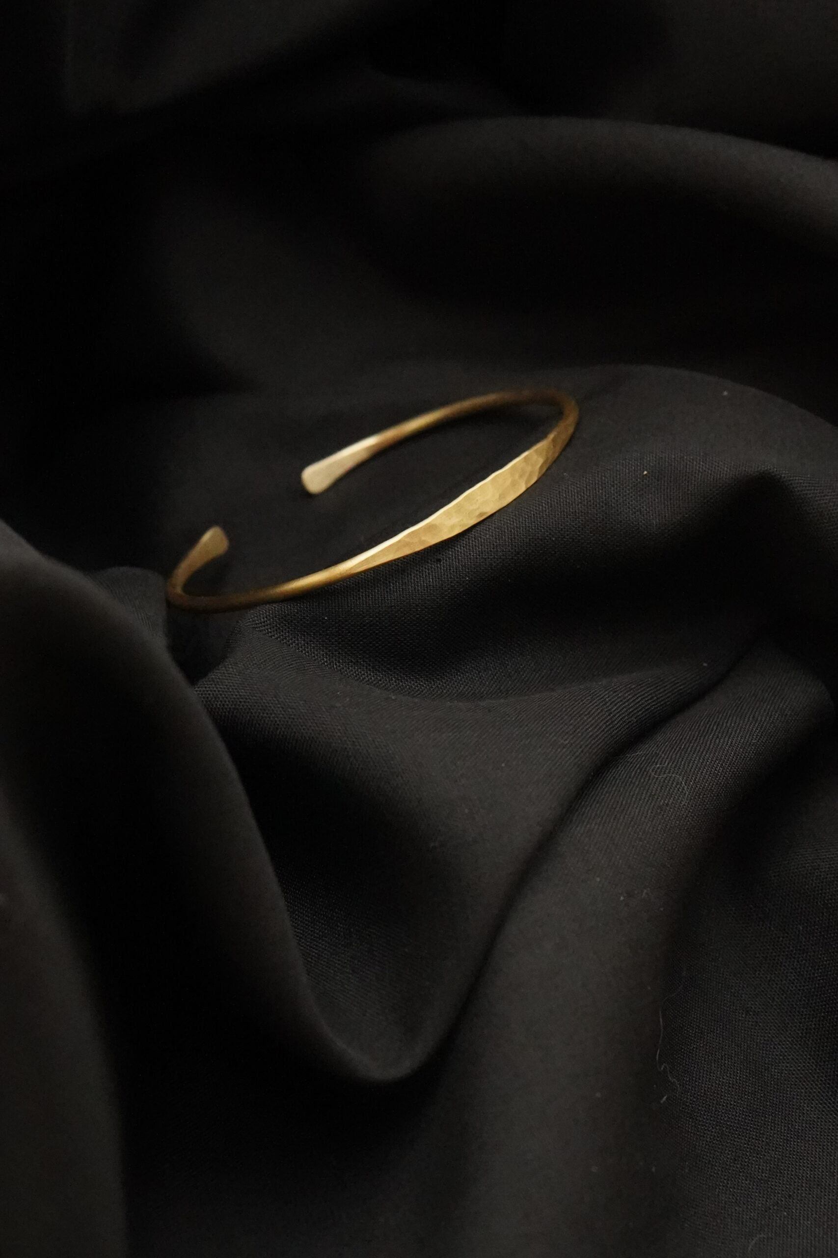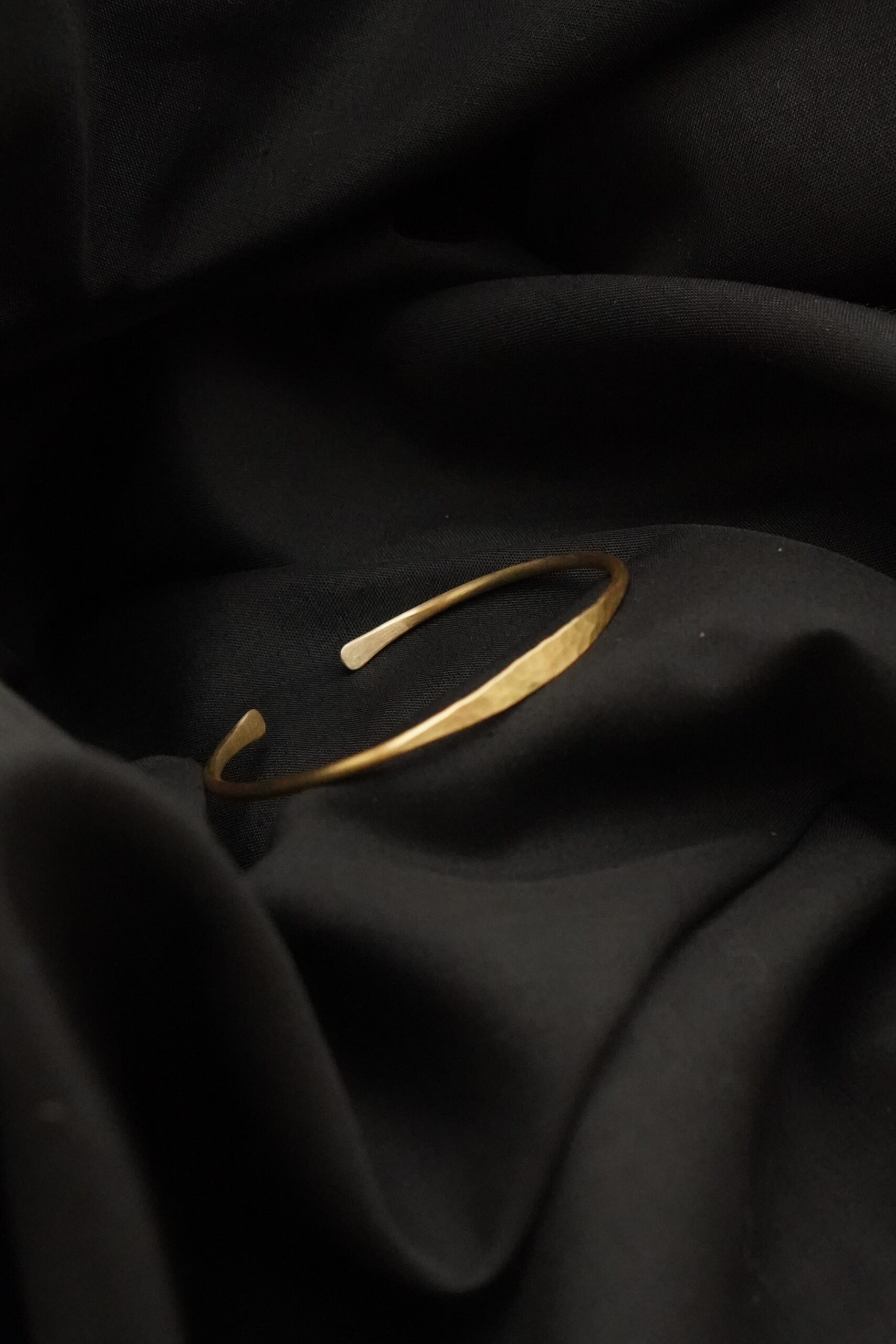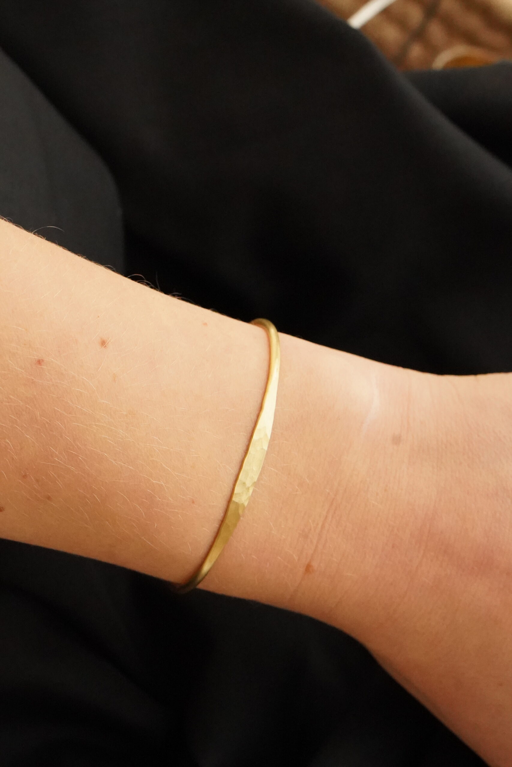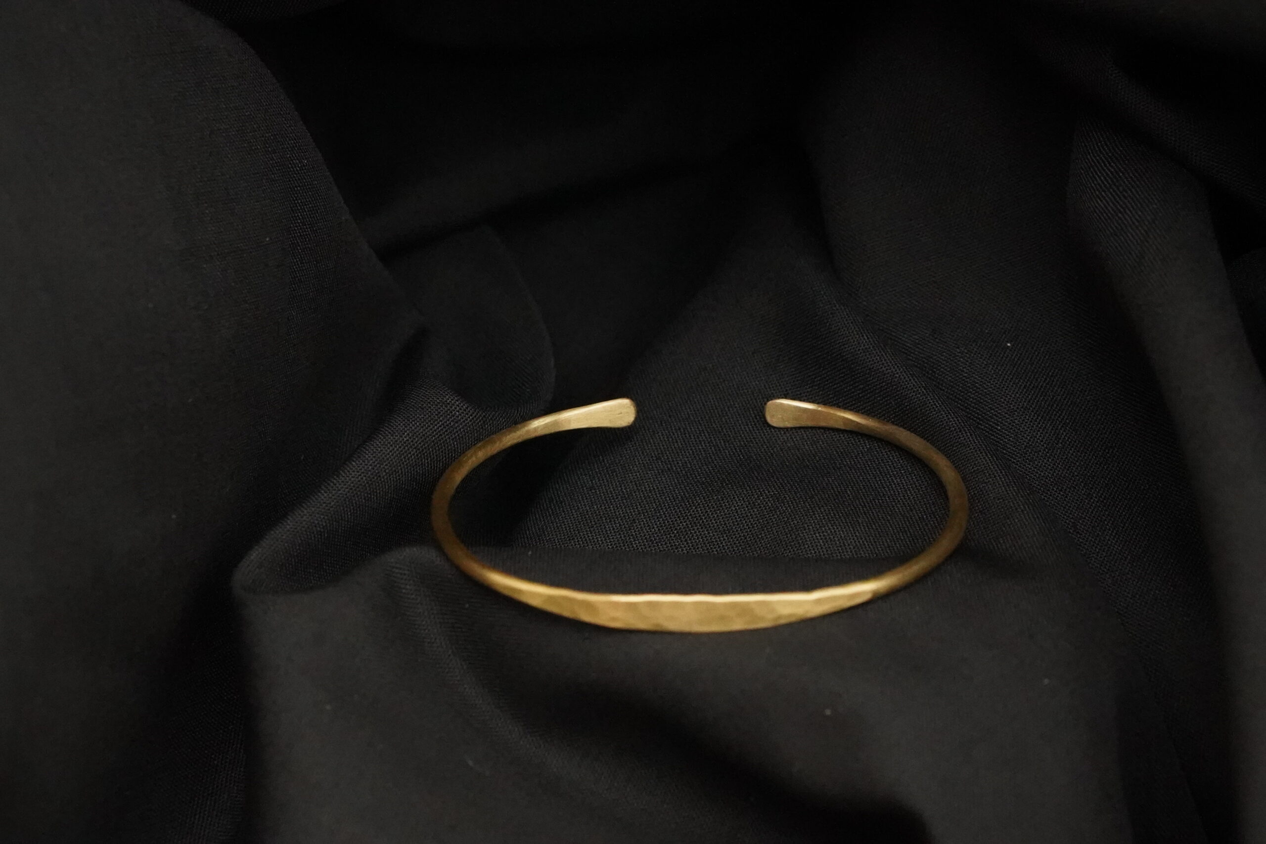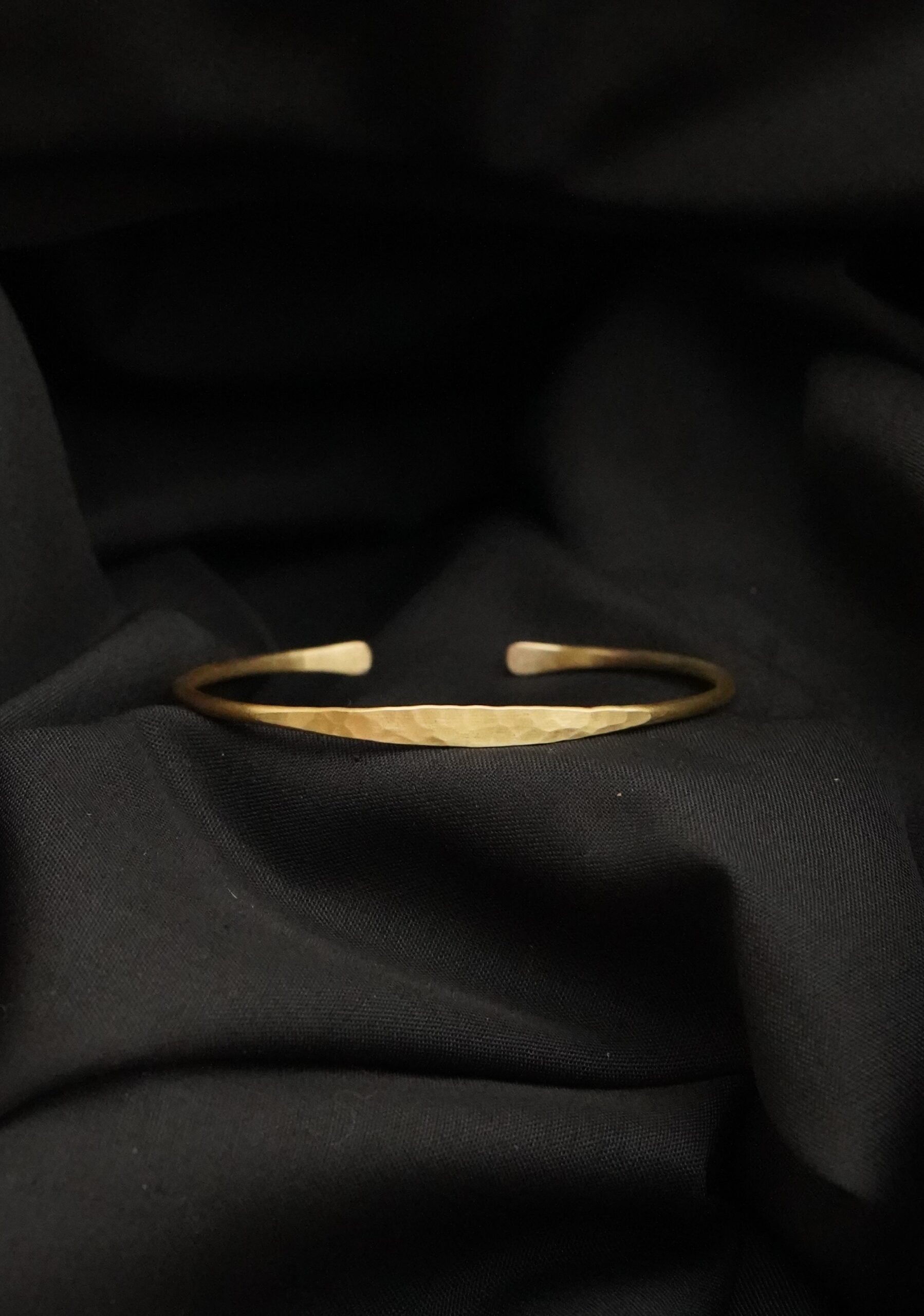 Dieser schlichte Armreif wurde sorgfältig von Hand aus Messing gefertigt und besticht durch seine klare, reduzierte Form. Ein besonderes Detail ist seine im Zentrum herausgearbeitete Hammerschlag Optik, welche den Armreif zum Glätzen bringt.