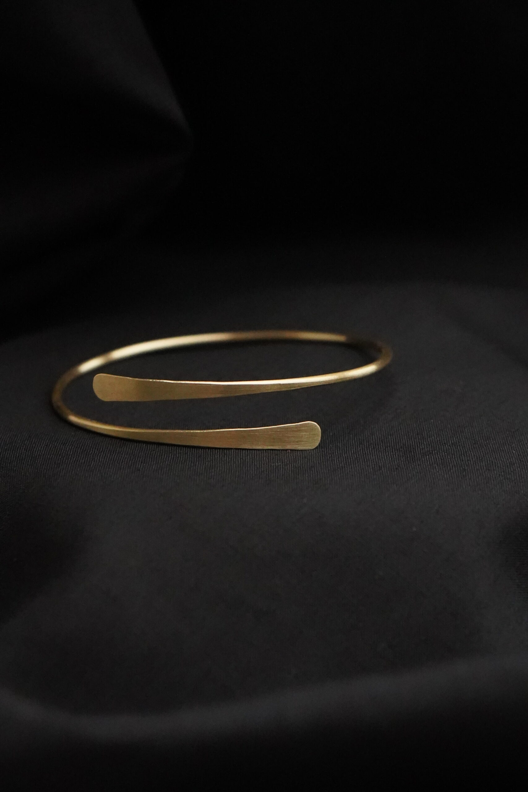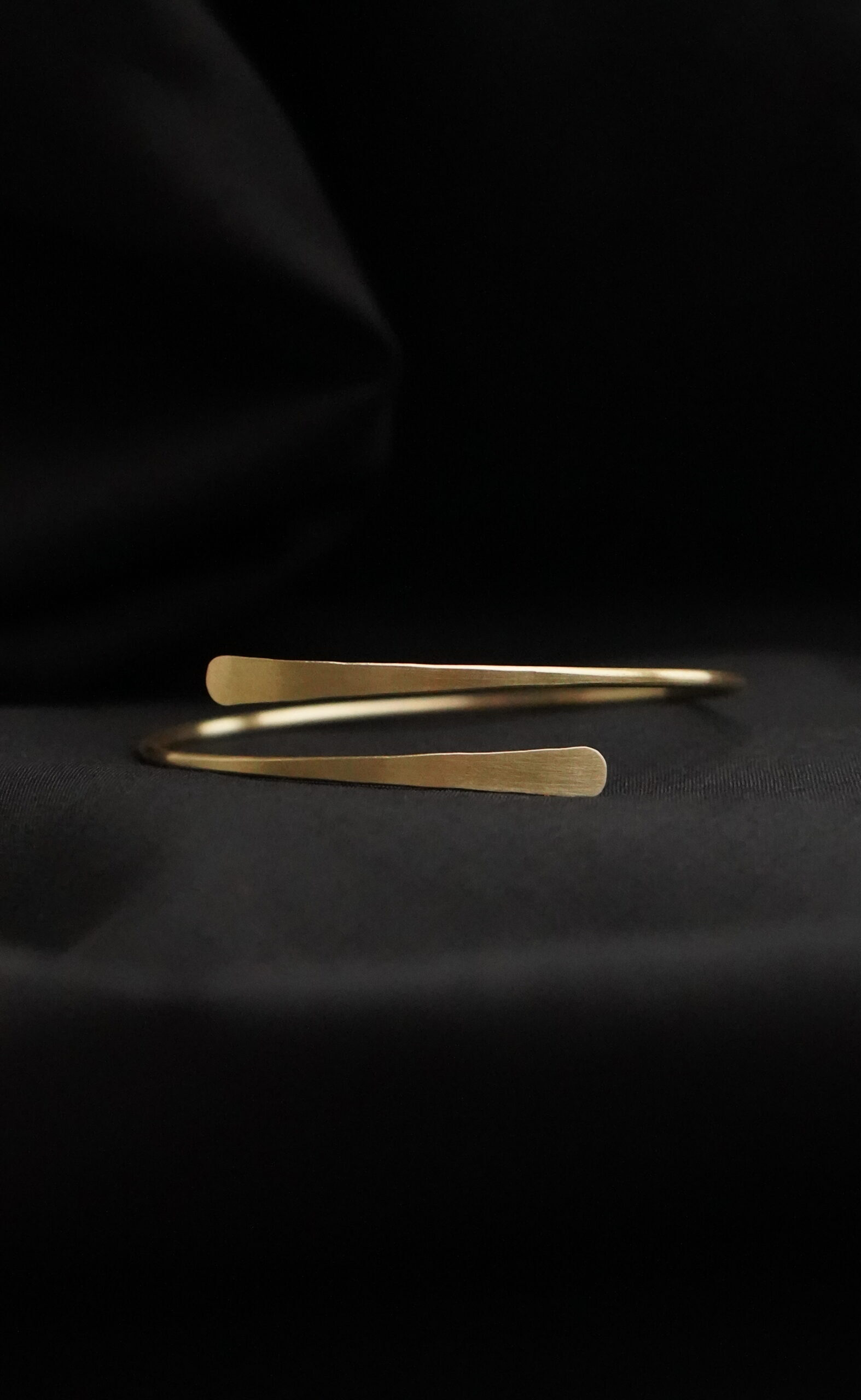 Dieser Armreif wurde sorgfältig von Hand aus Messing gefertigt und besitzt eine dezent goldschimmernde Oberfläche. Messing ist eine robuste Kupfer-Zink-Legierung, die für ihre Langlebigkeit, ihre warme Goldfarbe und ihre gute Hautverträglichkeit geschätzt wird. In vielen Kulturen wurde Messing seit Jahrhunderten für Schmuck und rituelle Gegenstände verwendet – häufig als Symbol für Schutz, innere Stärke und Klarheit. Der Innendurchmesser des Armreifs beträgt etwa 4,5 × 5,5 cm, und dank seiner offenen Form lässt er sich leicht anpassen, sodass er individuell größenverstellbar ist.