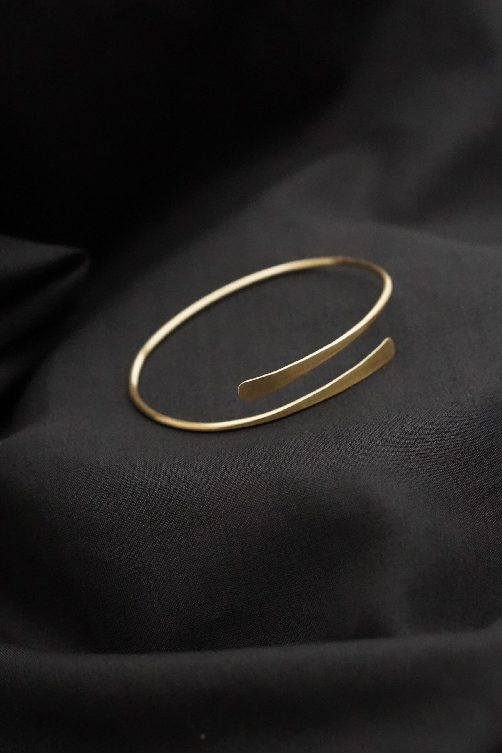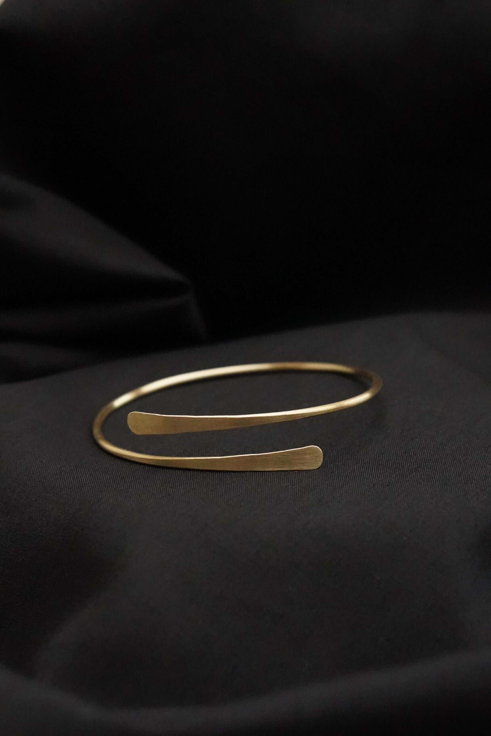 Dieser Armreif wurde sorgfältig von Hand aus Messing gefertigt und besitzt eine dezent goldschimmernde Oberfläche. Der Innendurchmesser beträgt etwa 4,5 × 5,5 cm, wobei der offene Ring leicht angepasst werden kann, sodass er individuell größenverstellbar ist.